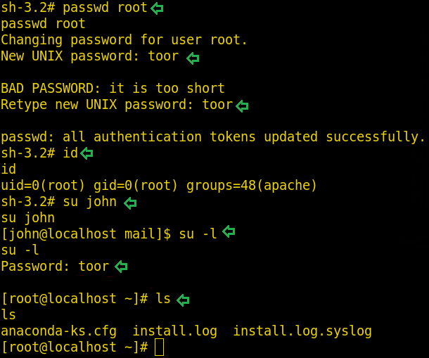 Let’s do some more operations. Head into the /home directory using command cd /home. In the home directory, we have to find out more users. As we are root, we can change any user password using the command passwd john similarly we can change the root password using the same command.