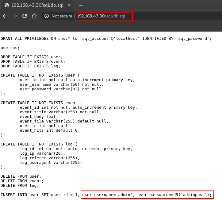 Upon traversing through sql/ directory, we found a db.sql and when opened it gave us all the information about the database including username and password just as shown in the image below: