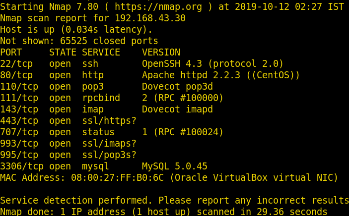 Now we will use nmap to gain information about the open ports and the services running on the target machine using the following command