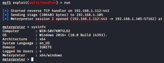 Now as we did in the earlier practical, we started a listener with the same configurations we used while crafting the payload. As soon as we provide the credentials in the pop in the screenshot above. The WMI will install the malicious MSI file on the target server which results in the meterpreter as shown in the image given below.