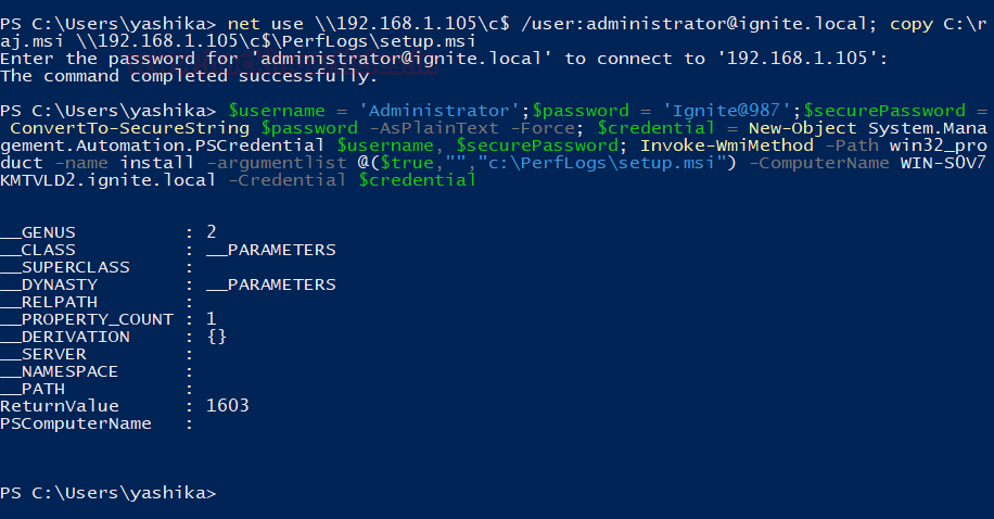 net use \\192.168.1.105\c$ /user:administrator@ignite.local; copy C:\raj.msi \\192.168.1.105\c$\PerfLogs\setup.msi Invoke-WmiMethod -Path win32_product -name install -argumentlist @($true,"","c:\PerfLogs\setup.msi") -ComputerName WIN-S0V7KMTVLD2.ignite.local -Credential (Get-Credential)