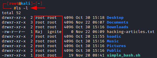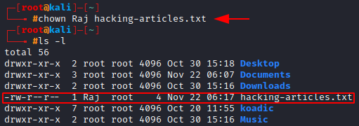 Let’s change the owner of hacking-artciles.txt from root to Raj