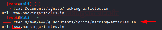 sed s/WWW/www/g hacking-artciles.in