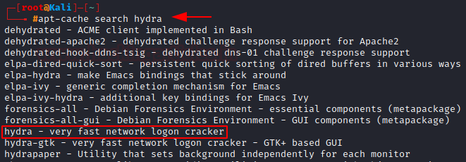 Type apt-cache search and then the package that you want to search for, let’s search for Hydra which is login cracking tool.