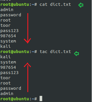 As the name suggests and we can reverse all the content using tac command which is just a reverse of cat command and it works for this purpose only.