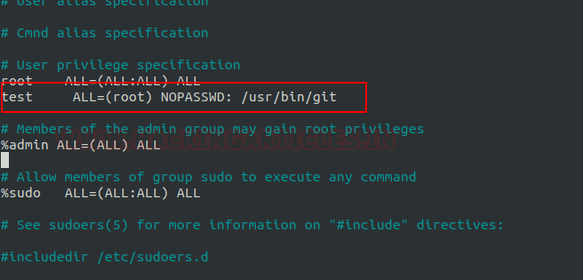 Then we look for sudo right of “test” user (if given) and found that user “test” can execute the git command as “root” without a password.