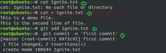 On framing the above command, it will add the file “Ignite.txt” with its file content with a comment “first commit” so that you can search it later.