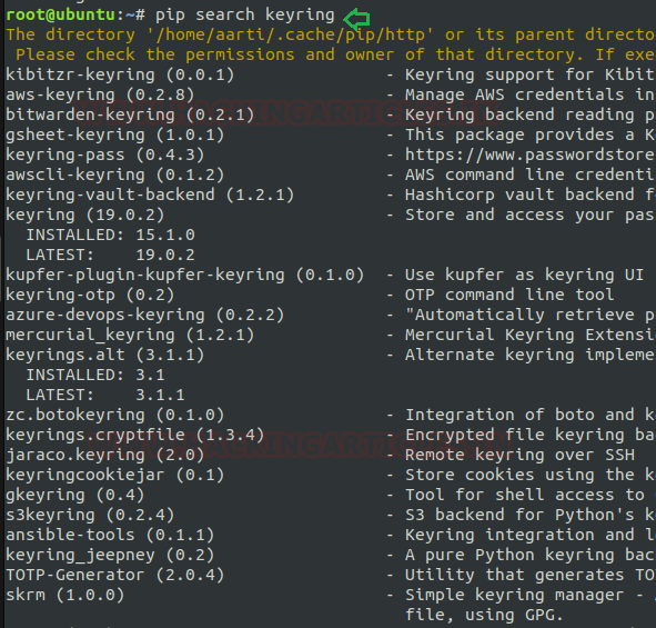 Most of the time, we wish to hunt for packages directly on the PyPI website. So PyPI delivers such search abilities for its index and a way to filter results. Now I’m framing the command as shown below to search for “keyring”.