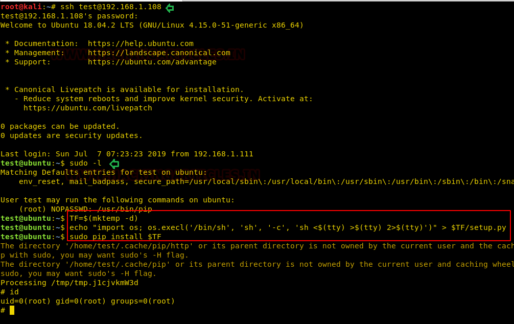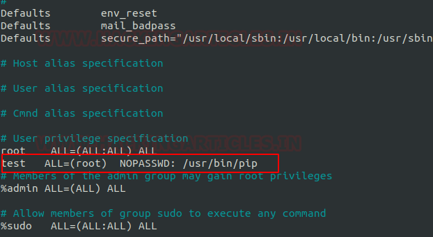 Then we look for sudo right of “test” user (if given) and found that user “test” can execute the pip command as “root” without a password.