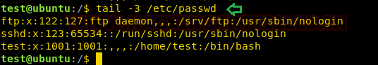 First, we will open our /etc/passwd file following by tail command which will read this file from its end and help us to know that the file ends with the user “test”.