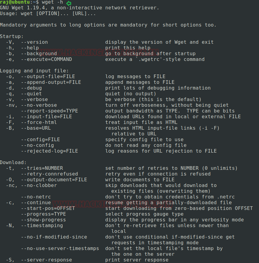 The more functionality of this command can be briefly understood by using its help command. Here we are using -h argument for this function. As we can see by the below image which showing list of many arguments that can be used with Wget command while executing it. For viewing as below image, we will simply type the command on our Linux screenshot as showing below:
