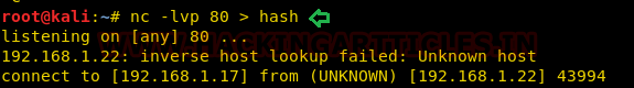 As we had already turned on the netcat listener on port 80 to receive the content inside the “hash” file.
