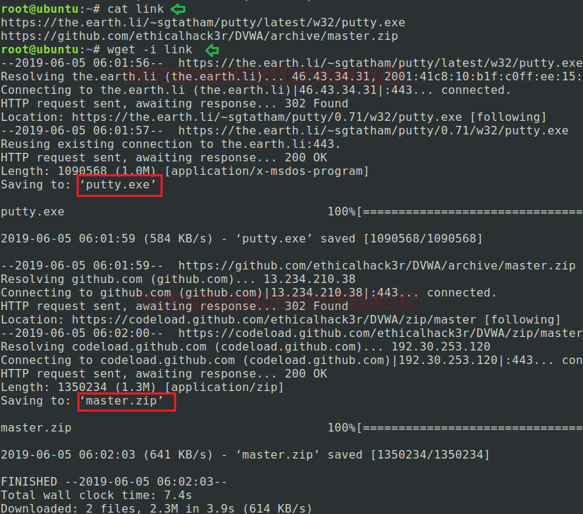 Here I’m creating a file by the name of “link” which contains two links and I want to download both links together. Type the below-mentioned command for performing the same task: