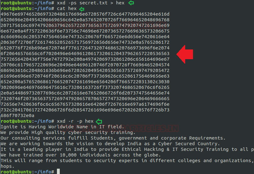 From the below image, it can be cleared that how xxd has created plain hex dump style for file “secret.txt” by restricting the plain text.