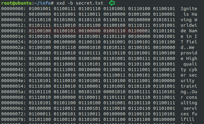 By the below image it’s clear that xxd has generated the hex dump for the file “secret.txt”.