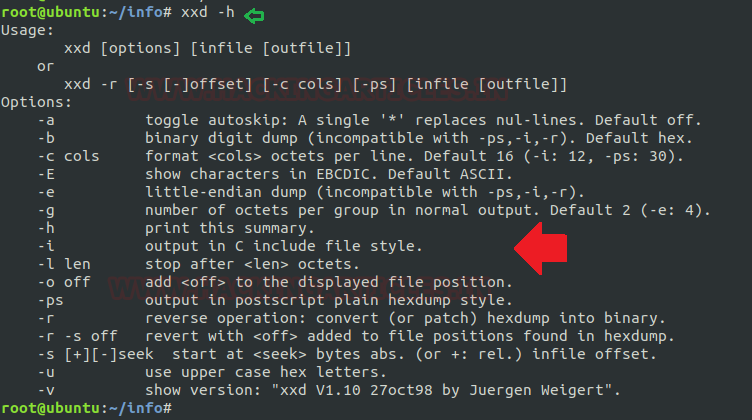 By typing the above command, we can achieve a list of arguments that can be used with xxd for generating hex dump of a given file.