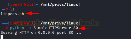 In the beginning, we run LinPEAS by taking the SSH of the target machine. In the beginning, we run LinPEAS by taking the SSH of the target machine and then using the curl command to download and run the LinPEAS script. But there might be situations where it is not possible to follow those steps. Hence, we will transfer the script using the combination of python one-liner on our attacker machine and wget on our target machine.