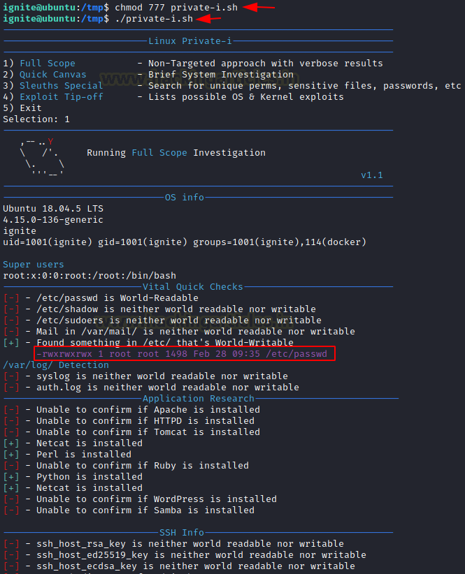 Here’s a snippet when running the Full Scope. This box has purposely misconfigured files and permissions. We see that the target machine has the /etc/passwd file writable. We are also informed that the Netcat, Perl, Python, etc. are installed on the target machine.