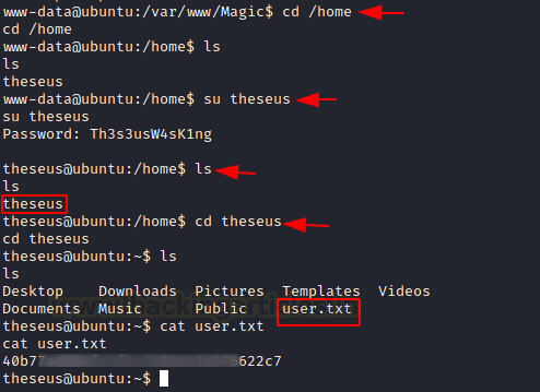 This is basically the credential that can be used to upload images earlier on the webpage where we used SQL Injection to get access. Now that we know that there is a user named theseus, let’s login into that user with these credentials. We used su to login as theseus. The user flag is inside the theseus home directory.
