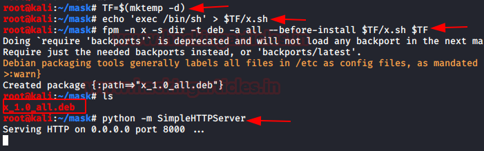 Now we need to craft a package using fpm and then that when installed with the help of dpkg it will grant us a root shell. First, we define a variable TF with the mktemp command which will create a temporary directory upon execution. Then we entered the shell invocation command into a shell file in the TF. Finally using the fpm, we crafted the contents of TF into a package. The resultant package was named x_1.0_all.deb. We ran the python script to create an HTTP server and transfer this deb file to the target machine.