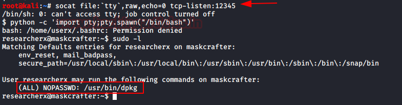 Before we execute a one-liner, we start a socat listener to capture the session that the target machine might generate. As soon as we execute the one-liner, we get a session on our local machine. Then we convert this shell into a TTY shell using the python script. Again, we ran the sudo -l command to check for binaries and their permissions. This time we have the sudo permissions on dpkg. We need to exploit this vulnerability to get root access to the machine.