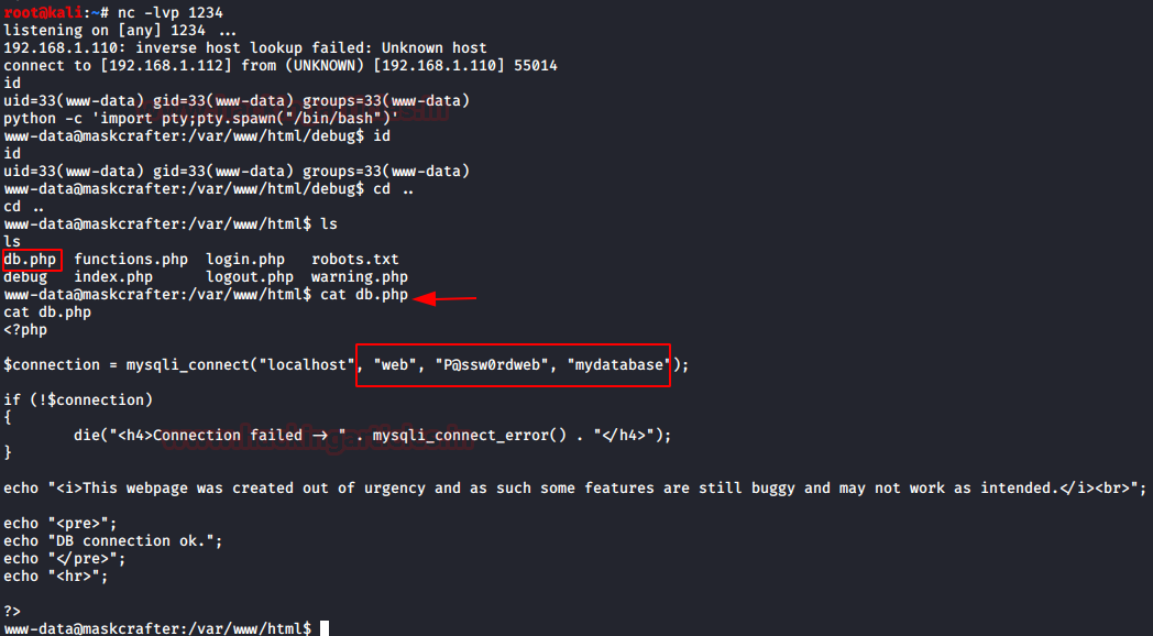 We start the enumeration with the /var/www/ directory. We have the debug directory that was mentioned earlier. Then, we see that it contains a php file by the name of db.php. We open it to find the set of credentials for the Database.