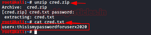 We went back to our local machine and used the credential that we just found to unzip the cred.zip file we got earlier. It contained a cred.txt. It read another set of credentials as shown in the image below.
