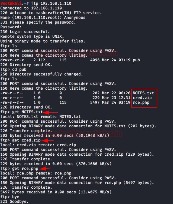 ftp 192.168.1.110 Anonymous ls cd pub ls get NOTES.txt get cred.zip get rce.php