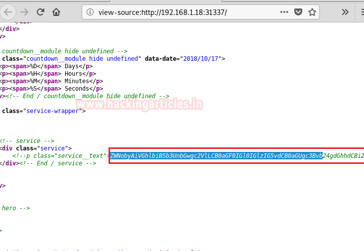 We take a look at the source code of the web service running on port 31337 and find a base64 encoded string.