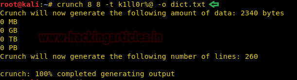 crunch 8 8 -t k1ll0r%@ -o dict.txt