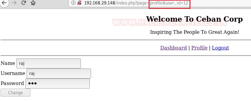 Once I logged in, I saw another their three captions “Dashboard, Profile, logout”. The profile caption denoted user_id and for raj, it is showing user-id=12 in the URL.