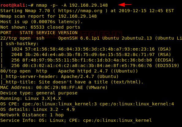 Now that we have identified our target using the above command, we can continue to our next step i.e. scanning the target’s IP to identify open ports and running services. We will use Nmap to scan the target with the following command: