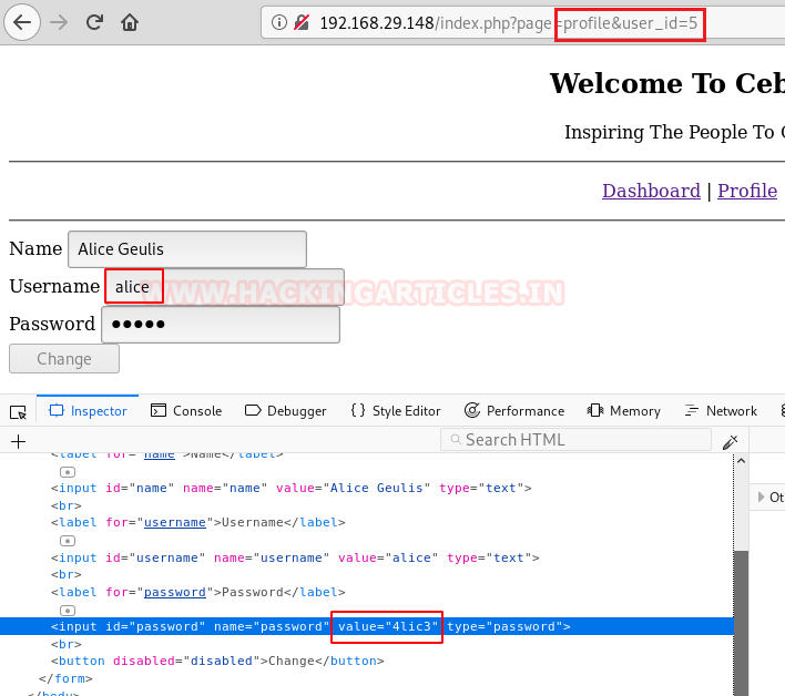 In the given URL, I tried to change user_id from user_id=12 to user-id=1 and luckily I saw the profile for another user, then frequently found the profile for alice as user_id=5, Moreover, the password field was auto filed thus I was able to read the password from inside the inspect element.