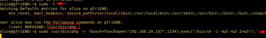 Without wasting time, I looked for sudo rights and fortunately found that alice can run the php program as a sudo user. Then I start the netcat listener in a new terminal and run the php reverse shell command in the host terminal.