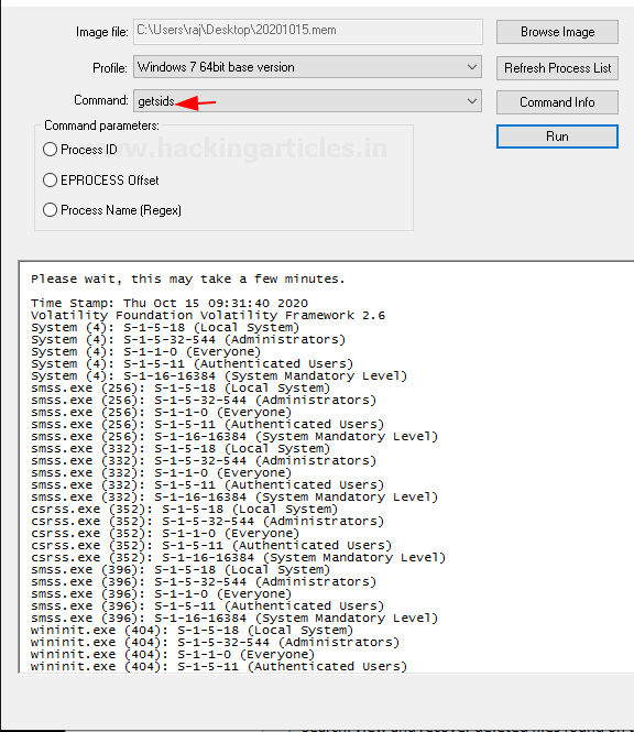 Download the tool and run it. Now choose the dump file you previously created and select the profile of the image you created, which you can use in place of the imageinfo command. Now click on Refresh Process List, and you can run all the commands.