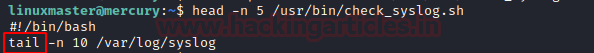 Using head command we read the script, the script was written to execute the tail program for reading last 10 syslog entries.