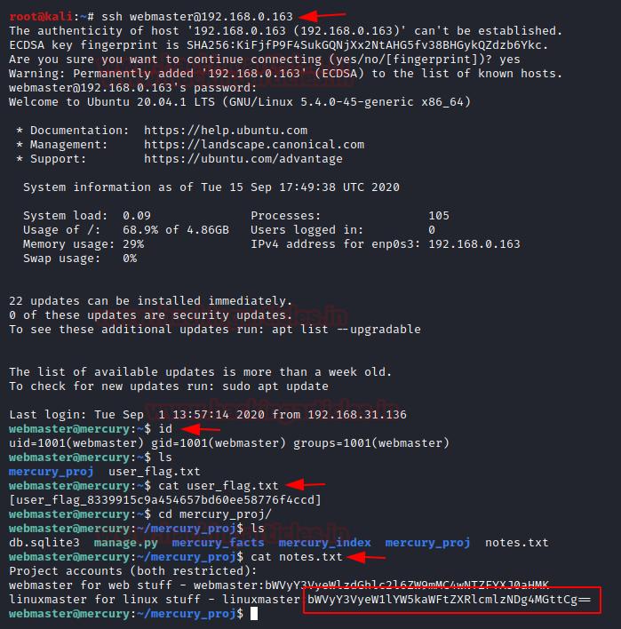 Moving Further if you remember the port scan results gave us two open ports: another one was ssh. We will use ssh service to login into the user “webmaster” using the command: