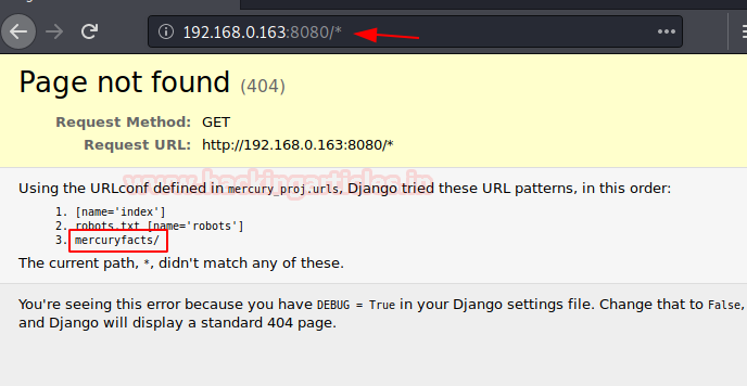 At last, I just hit “*” (asterisk) in the URL as shown here and it gave error page that reveals another path i.e. /mercuryfacts.