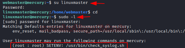 So, we logged in as linuxmaster with the help of password enumerate above and check sudo rights for the user. Here we saw linuxmaster can execute a bash script i.e. /usr/in/check_syslog.sh as root but in preserve environment and this is due to SETENV tag.