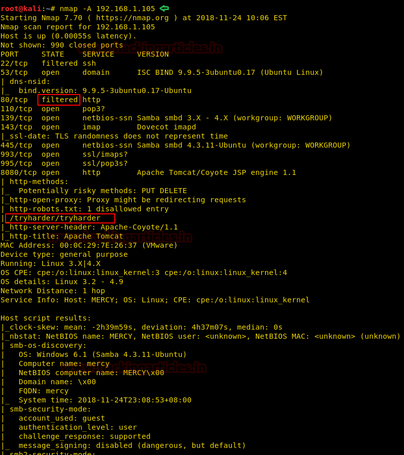 Since port 80 is filtered we cannot directly browse the Target IP in the Browser. Further, we notice that port 8080 is open for Apache Tomcat/ Coyote JSP Engine 1.1. and here we got a clue as an entry /tryharder/tryharder in robot.txt as it might come in handy later on.